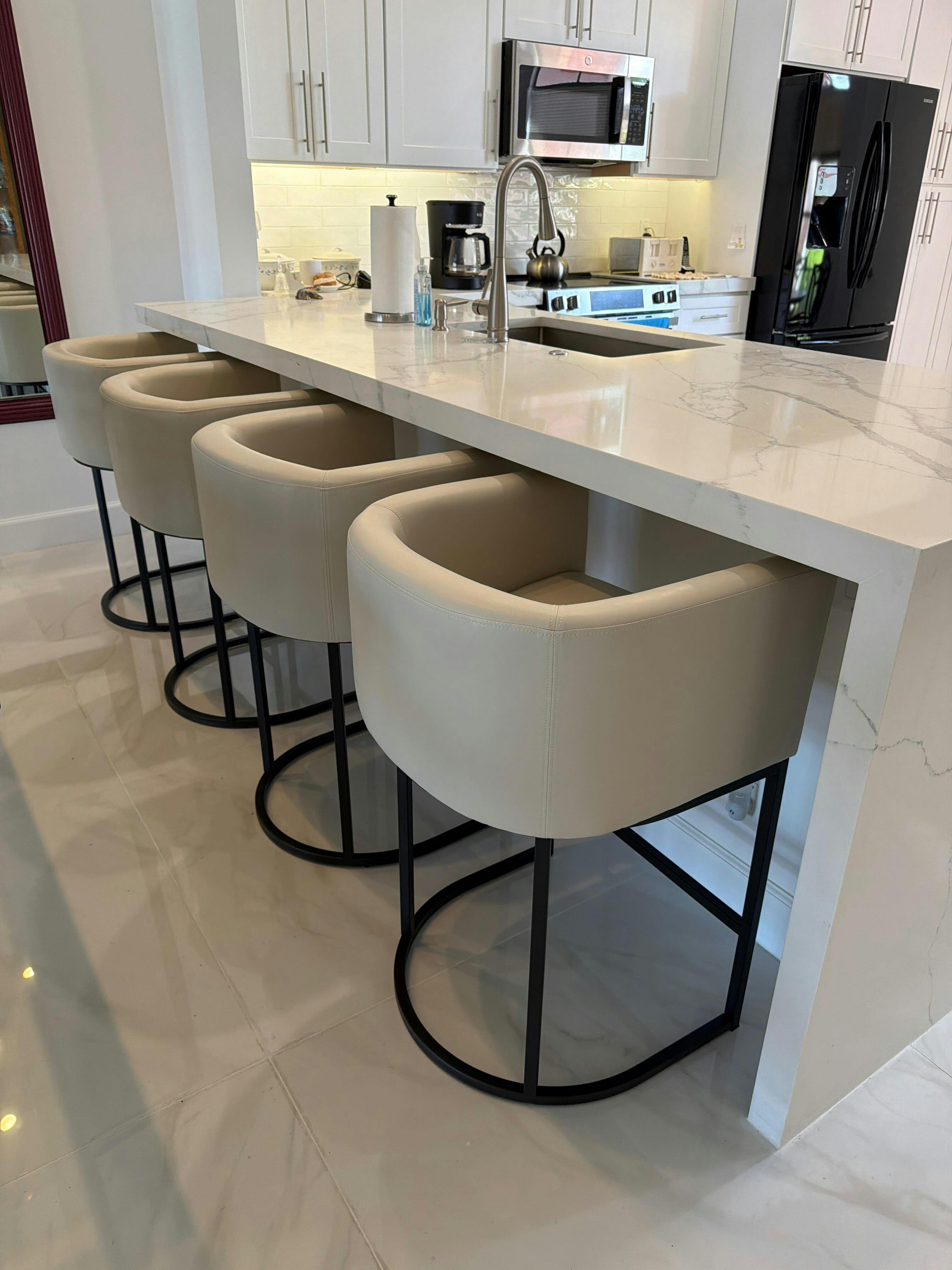 • Elegant Seating: Get luxury experience with the Jessica Barstool's exquisite fabric / faux leather seat (find material in color choices). Its soft, stylish texture adds a touch of sophistication to your space while ensuring maximum comfort during extended use.