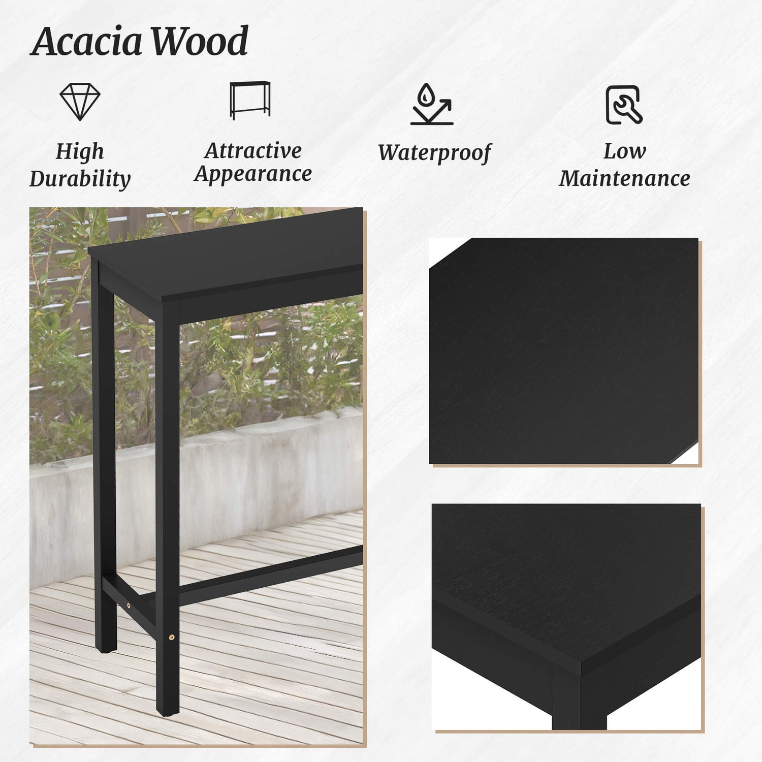 - Waterproof: Constructed with waterproof acacia wood, making it ideal for both indoor and outdoor use.